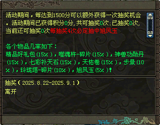 在本次活动时间内玩家每获得1500积分(在活动面板兑换道具使用一个江湖币获得1个积分),可以到京城NPC秦仙儿(287,273)额外抽奖一次(本次积分抽取的物品均不绑定);(浮生若梦、浊酒狂歌服务器以游戏内活动面板实际道具为准)