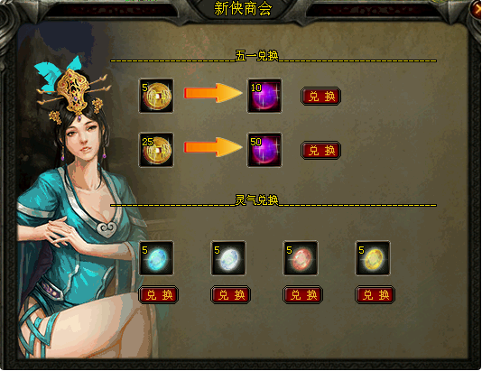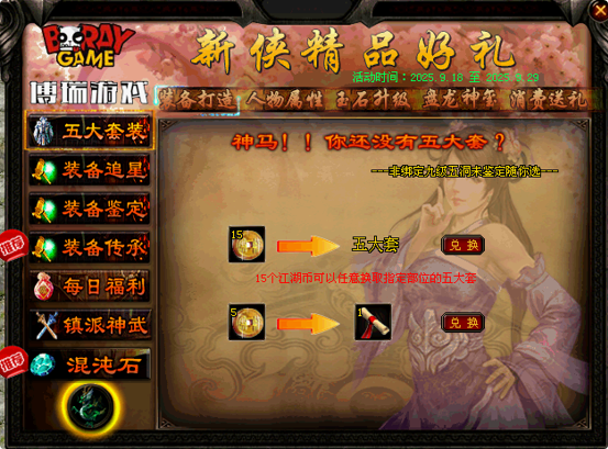 活动期间点击游戏界面右上角的活动礼盒,即可使用江湖币兑换各类道具!(此处消耗的江湖币将获得相应的积分,获得的积分可以在人物属性面板,积分商城兑换大量极品物品)
