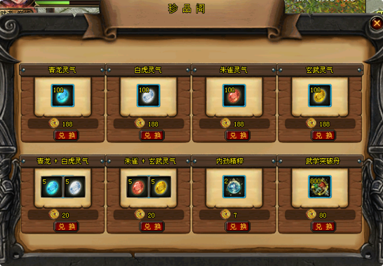 活动期间可前往京城(308,219)珍品阁 月牙儿NPC处,月牙儿为各位带来了紧缺道具---------四兽灵气和内劲精粹!使用江湖币即可兑换对应的道具。(此处消耗的江湖币将会获得对应的积分)
