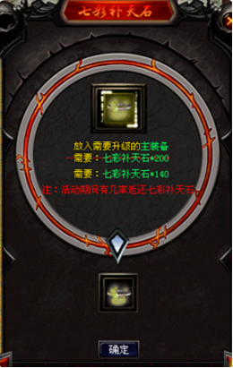 在活动期间使用七彩补天石进行装备升阶会按照一定几率返还七彩补天石,且装备传承阶层是至尊和耀世、传说阶层使用七彩补天石进行传承享7折,折扣后还会返还七彩补天石!