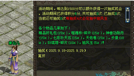 在本次活动时间内玩家每获得1500积分(在活动面板兑换道具使用一个江湖币获得1个积分),可以到京城NPC秦仙儿(287,273)额外抽奖一次(本次积分抽取的物品均不绑定);(浮生若梦、浊酒狂歌服务器以游戏内活动面板实际道具为准)