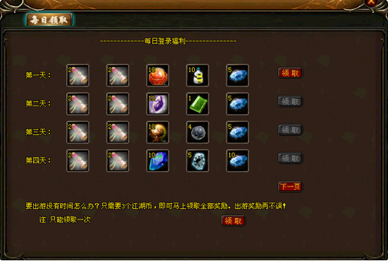 活动期间登录游戏即可前往京城(300,215)登录领取NPC签到领取国庆福利,每日可领取1次。活动期间没有时间登录游戏的玩家,花费3个江湖币既可一次性将10天的奖励全部领取(根据玩家的实力不同,签到的道具不同,道具均为绑定)