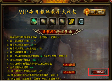 开通月卡VIP即可每日在VIP面板点击一键挑战,省时省力又省心!